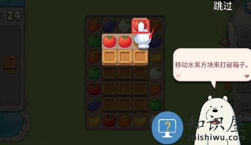 1、进入游戏移动红色的西红柿往下继续3消。