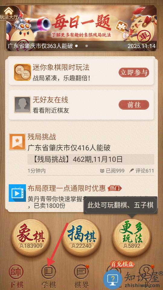 残局包括每日残局,残局-铜钱场,残局-挑战,残局-学习以及残局-闯关这几种玩法