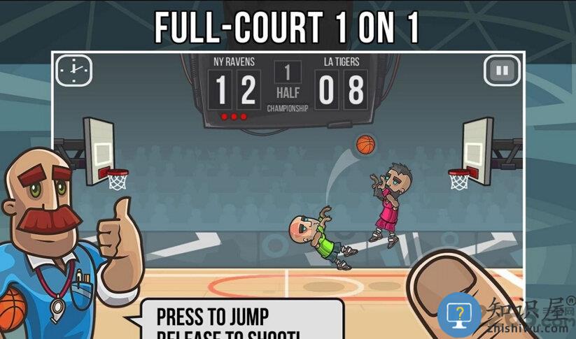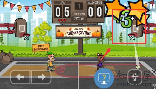4、我们按住屏幕左下角的两个箭头可以控制角色移动,用手指按住屏幕右侧空白区域可以控制角色跳投,不过跳投的时候的注意一点,在主角跳到空中的时候就得放开手指,否者我们的角色是不会将篮球投出去的。