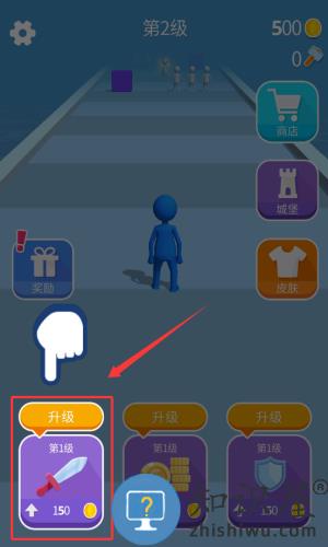 3、点击红框标注的剑图标升级按钮,花费150金币提升武器等级。