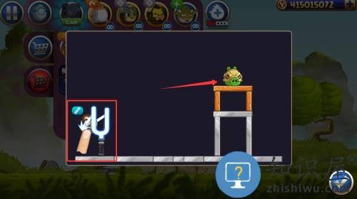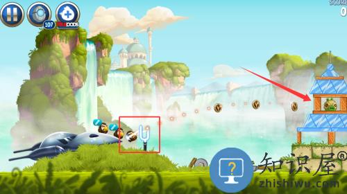 3、操控红框小鸟攻击蓝色塔楼,击败顶部绿色小猪。