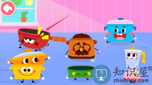 3、根据红框箭头提示,选择深红色平底锅进行互动。