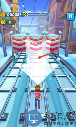 3、按红框箭头提示跳跃,避开冰柱障碍物继续奔跑。
