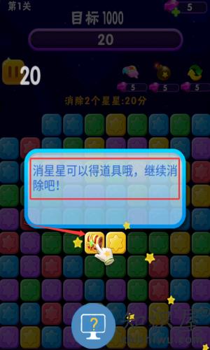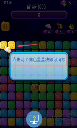 2、根据红框箭头提示,点击两个同色星星块进行消除。