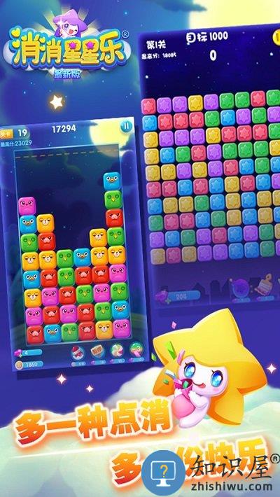 可爱的星星,欢快的消消乐 规则简单好玩。 只需点击两个或两个以上图标相同的方块即可消除。没有时间限制,每个阶段都有一个目标,完成即可进入下一关。简单轻松的治愈系游戏。游戏虽然简单,但想要玩出很高的分数还是要耗费不少脑细胞的。