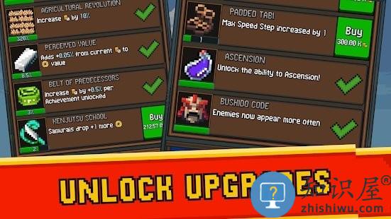 渐进式游戏中以忍者的身份开始你的冒险,使用适时的武士刀斩杀来袭的敌人,增加你的 Speed Step 组合来增加你的金币并建立你自己的村庄。