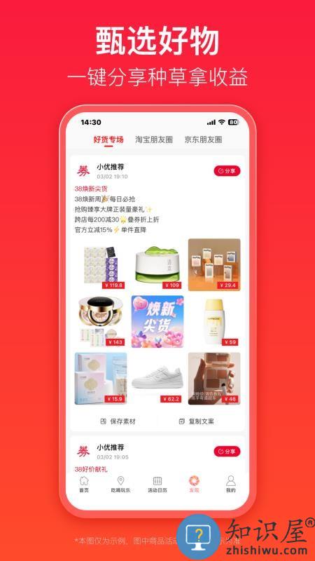 4、分享经济模式:提供丰富的商品图文素材库,用户可通过分享促成交易,从而赚取推广佣金,实现消费增值。