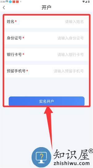 3、填写姓名及身份证号等信息,提交完成实名开户。