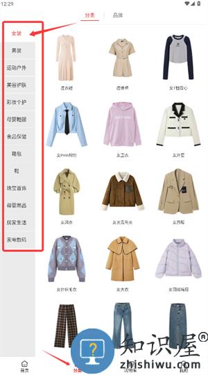 1、点击底部分类栏,在左侧选择女装或男装等品类浏览商品。