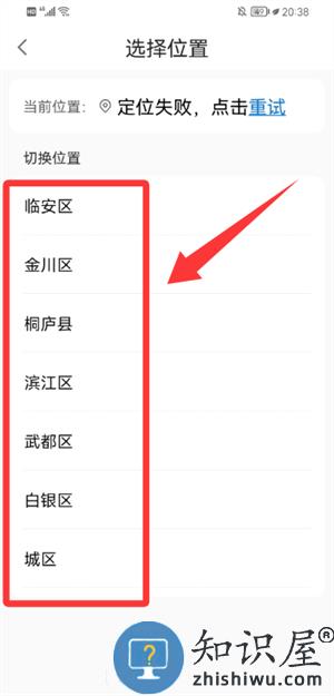 1、在选择位置页从区域列表中选定城区,完成切换。