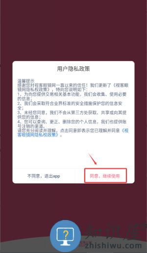1、启动视客眼镜应用,在隐私政策页面点击“同意,继续使用”授权。