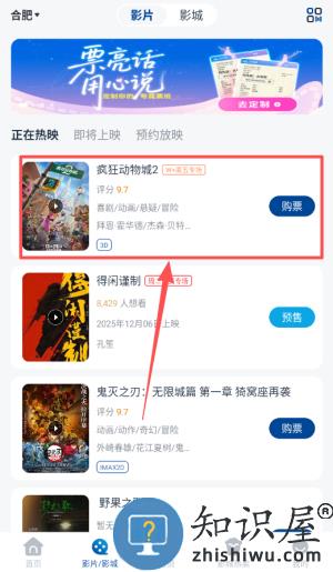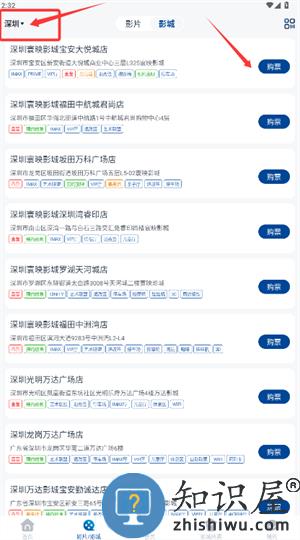 2、在影城选择页面定位所在城市影院,确认后点击购票选项。