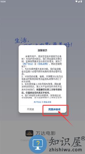 1、启动万达电影应用后,仔细阅读温馨提示内容,点击同意并继续。