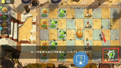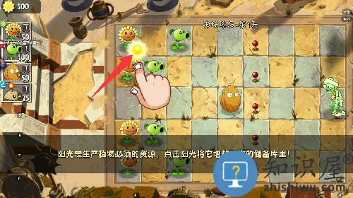 1、进入游戏界面,收集阳光是必须的资源,点击收集。