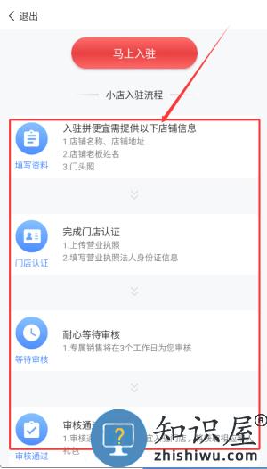 4、入驻引导页面详细说明资料填写、门店认证、提交审核及结果通知步骤。