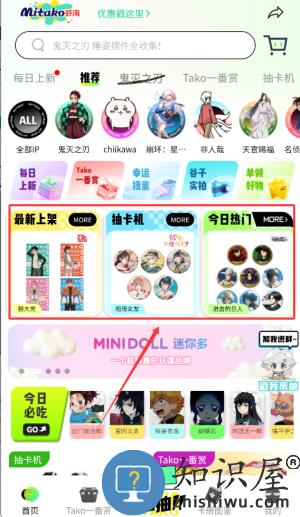 3、首页提供最新上架商品、趣味抽卡互动及当日热门内容推荐。