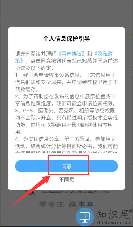 1、在看枣庄APP中点击"同意"个人信息引导,进入服务页面。