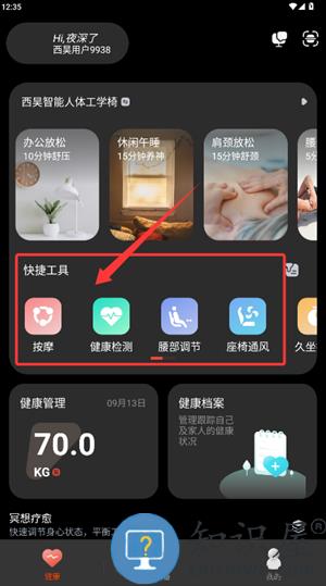 2、在健康页面,可在快捷面板中使用按摩或健康测试等特色功能。