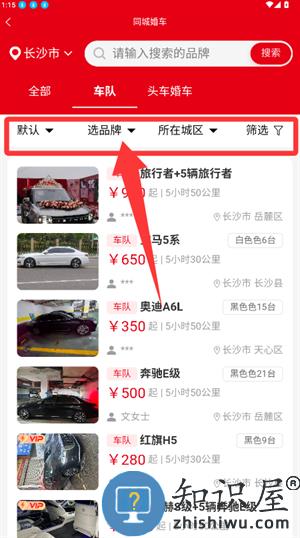 2、按品牌或区域筛选,选定车辆后查看其详细信息。