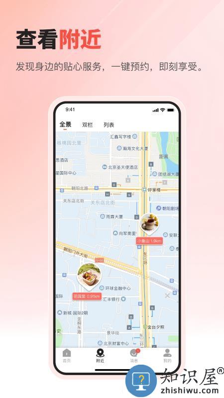 3、附近界面支持全景、双栏和列表三种模式,方便查看周边。