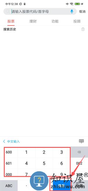 3、在搜索页输入股票代码或首字母,点击确定查找。