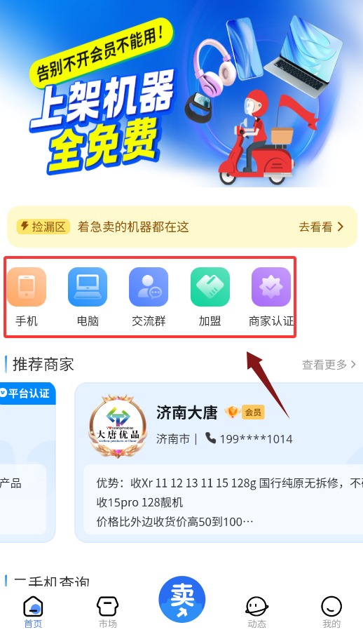 2、首页设有手机、电脑、交流群、加盟及商家认证等功能入口。