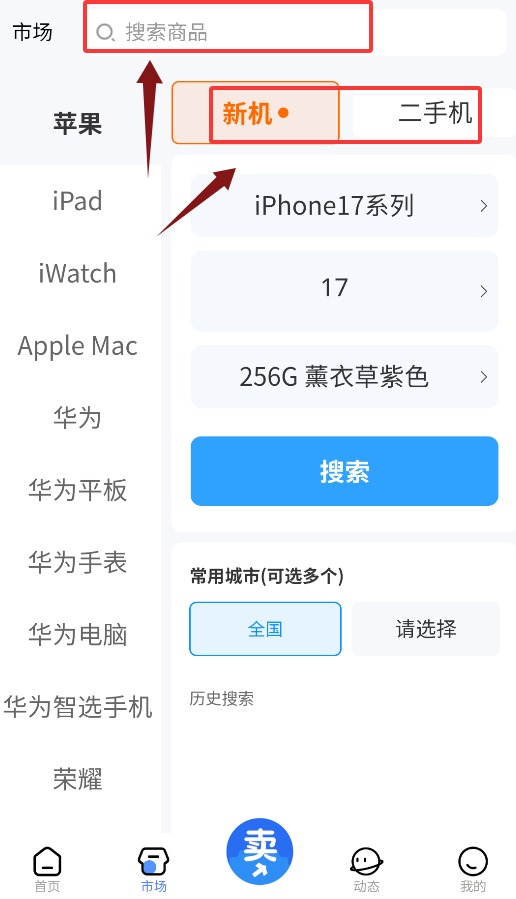 3、市场界面可按品牌、新机或二手机等类别筛选搜索商品。