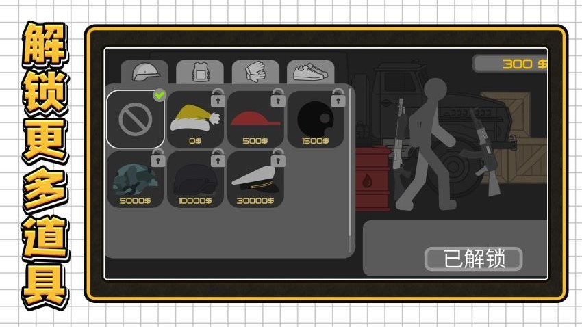 1、提供丰富的角色自定义选项,玩家可使用金币购买多种风格帽子与外观配件,打造个性独特的火柴人形象。