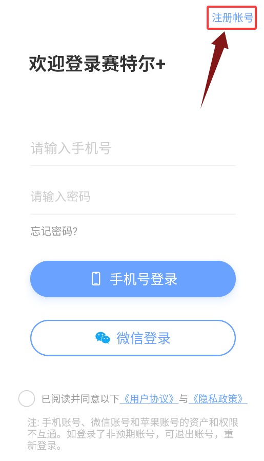 2、在登录页点击右上角注册按钮,即可跳转至新账号创建页。