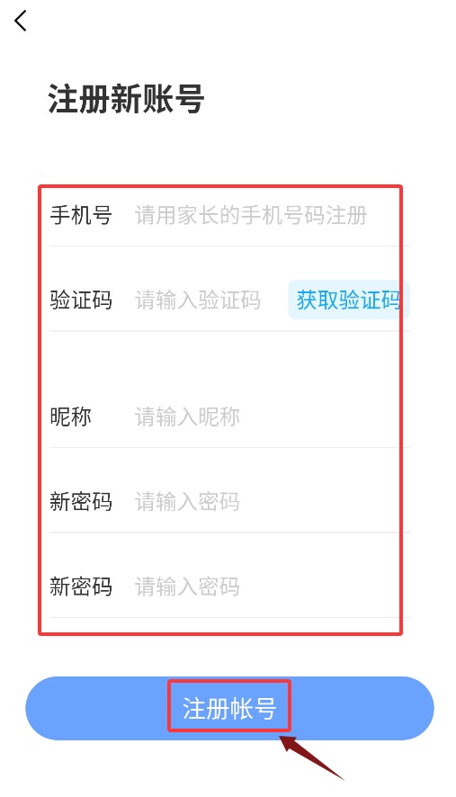 3、注册时需输入手机号、验证码、昵称,并设置与确认新密码。