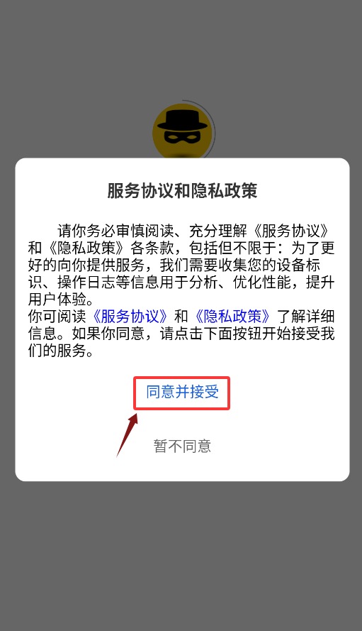 1、首次启动应用需点击同意并接受,确认后方可进入主界面。