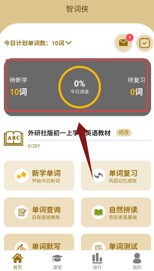 2、首页显示待新学、今日进度、待复习与单词查询等学习模块。