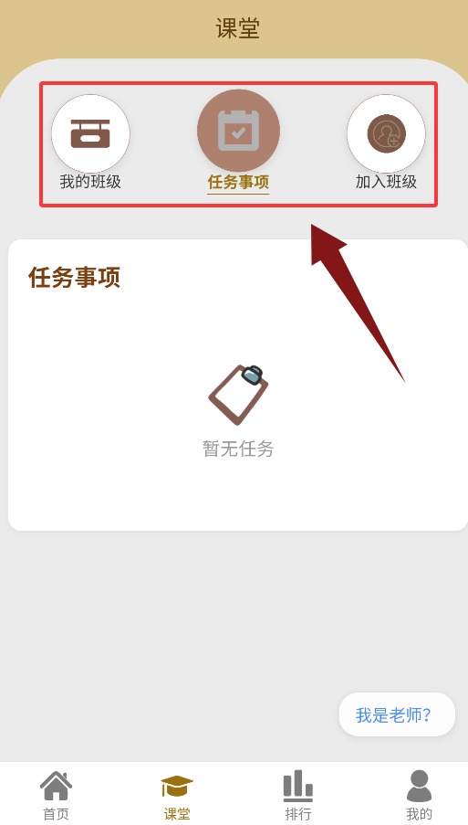 3、课堂界面可查看我的班级、任务安排及加入新班级功能。