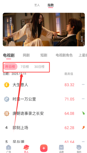 3、艺人专区展示了不同时间维度的榜单排名,包括昨日贡献榜七日热度榜及三十日综合影响力榜单。