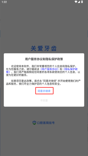 2、首次启动需在协议页面点击同意并继续进入应用。