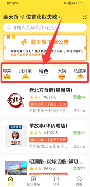 1、在首页选择特色菜系标签,浏览对应商家列表。