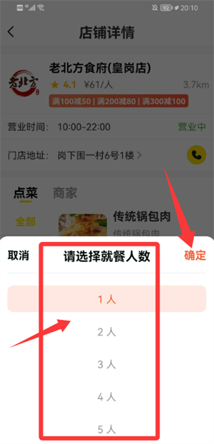 2、进入目标商家页面,选择就餐人数并进行确认。