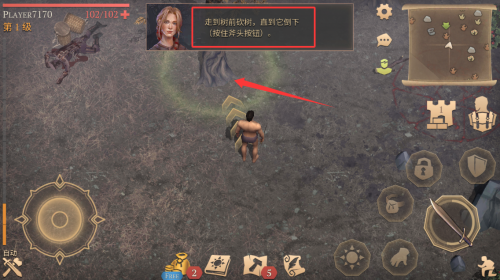 3、走到树前,按住斧头按钮砍树直到其倒下。