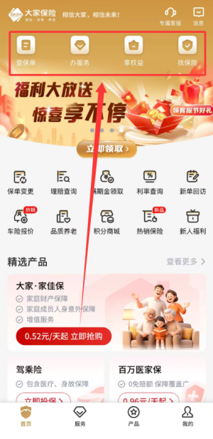 3、首页提供了保单信息查询、在线业务办理、会员权益查看及保险产品选购四大核心功能模块入口。