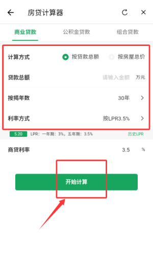 3、在计算器页填写贷款信息,点击开始计算获取还款数据。