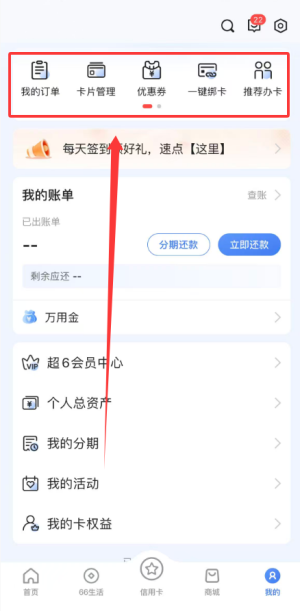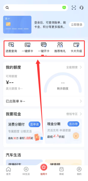 2、信用卡板块支持用户查询申办进度、快速绑定卡片至支付工具、在线激活新卡、参与推荐奖励活动及申请卡片等级升级。