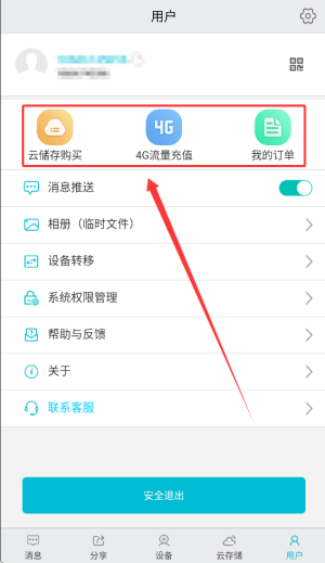 4、进入个人中心,可查询云存储套餐、充值4G流量及查看订单记录。