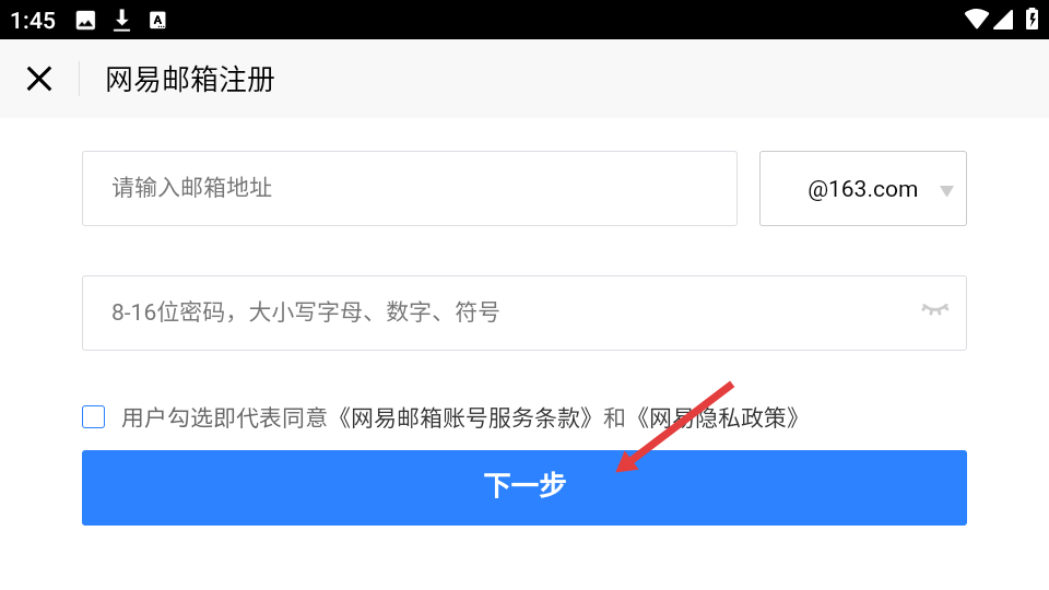 3、勾选下方协议后填写邮箱密码点击下一步完成注册。