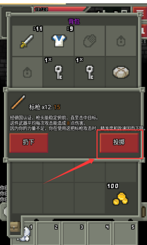 3、在背包界面,将标枪装备并点击投掷按钮。