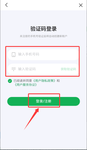 2、在登录页输入手机号验证码,点击登录或注册完成验证。