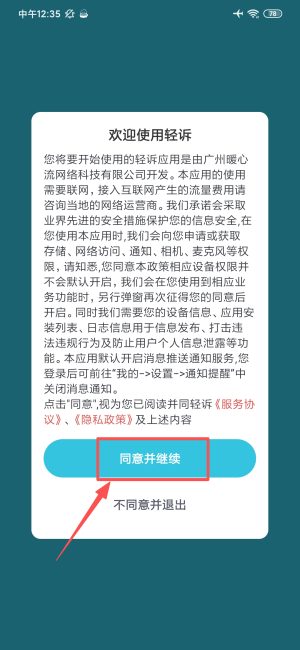 1、于欢迎页面点击同意并继续,确认后进入登录界面。