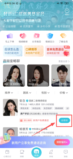 3、进入首页后选择目标咨询师,点击去倾诉按钮发起咨询。