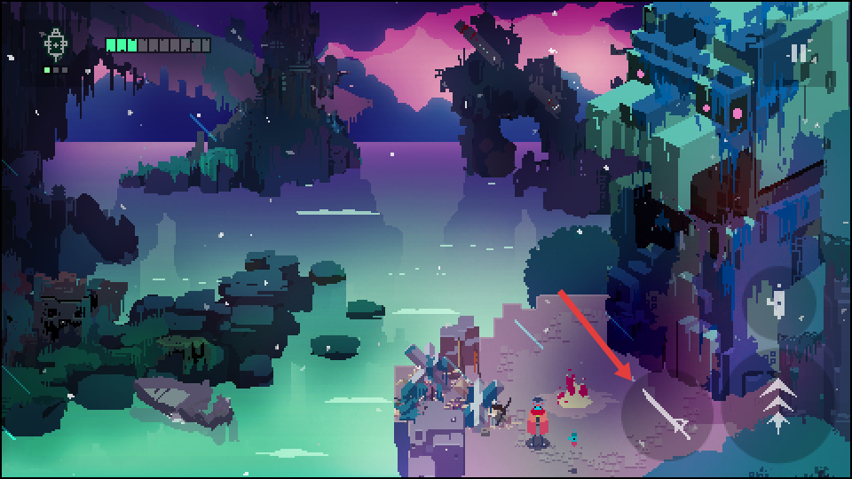 hyper light drifter并不只是画面精美而已,它还运用其画面给玩家提供指引,让玩家放松。游戏中壮阔的景致让玩家在一场场难度极高,节奏紧促的战斗之间舒缓下来。