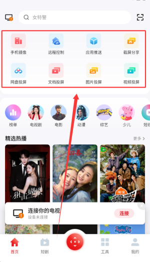 3、首页集成了手机镜像、远程控制、网盘与文档投屏以及应用推送功能。