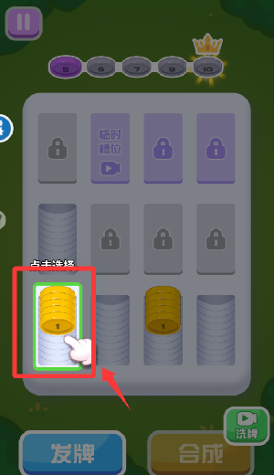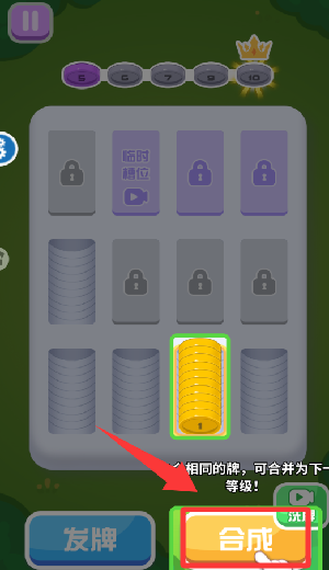 4、需将颜色相同的硬币移动至同一卡槽,完成合并以达成阶段目标,积累优势。